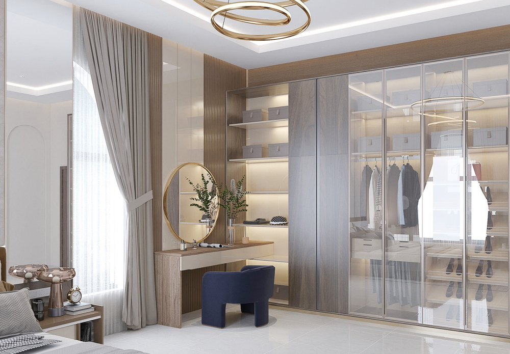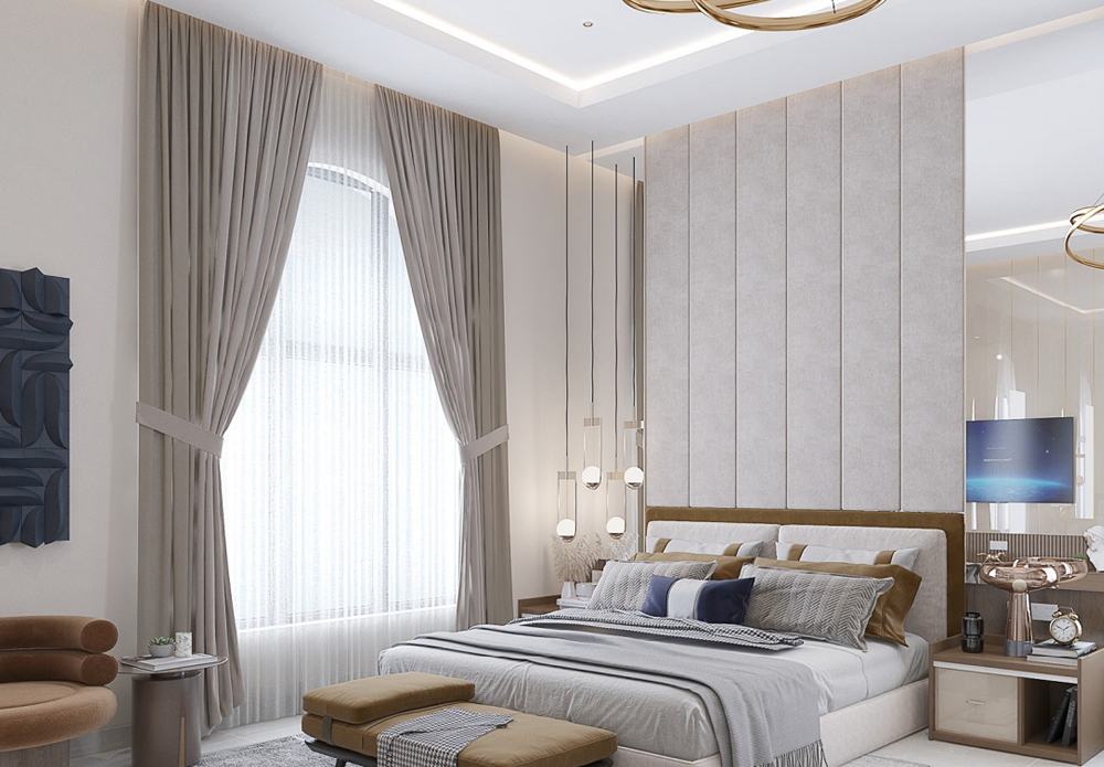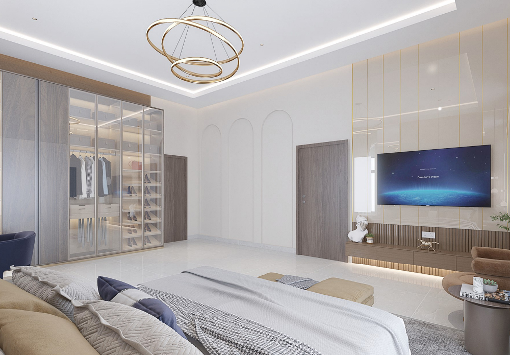 This bedroom 3D design features a custom bed, an elegant dressing table, a spacious wardrobe, a private closet, and a TV console. The color palette and textures are curated to create a calming yet stylish ambiance.