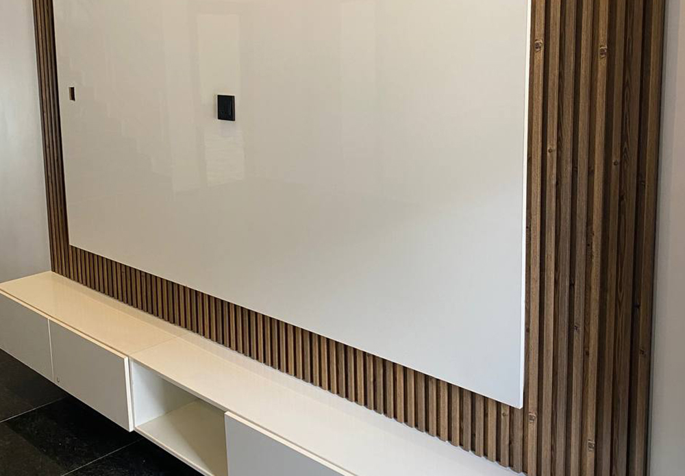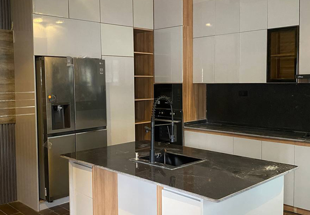 This Wuse-based furniture project features a striking TV console in light ash, black, and white tones,