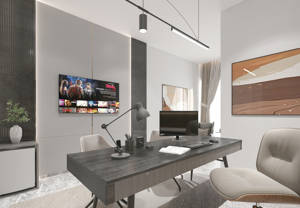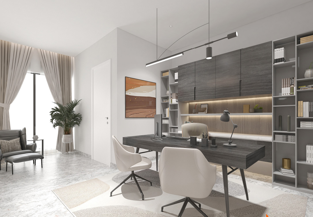 This 3D study design in Jahi includes an office desk, comfortable seating, storage units, and subtle décor to inspire focus. Natural light and organized layout enhance both work efficiency and aesthetic charm.