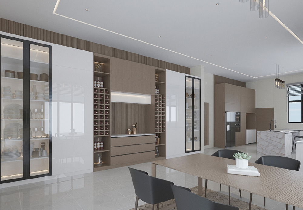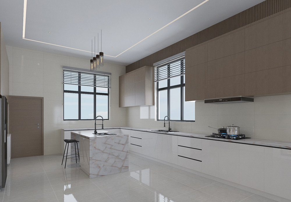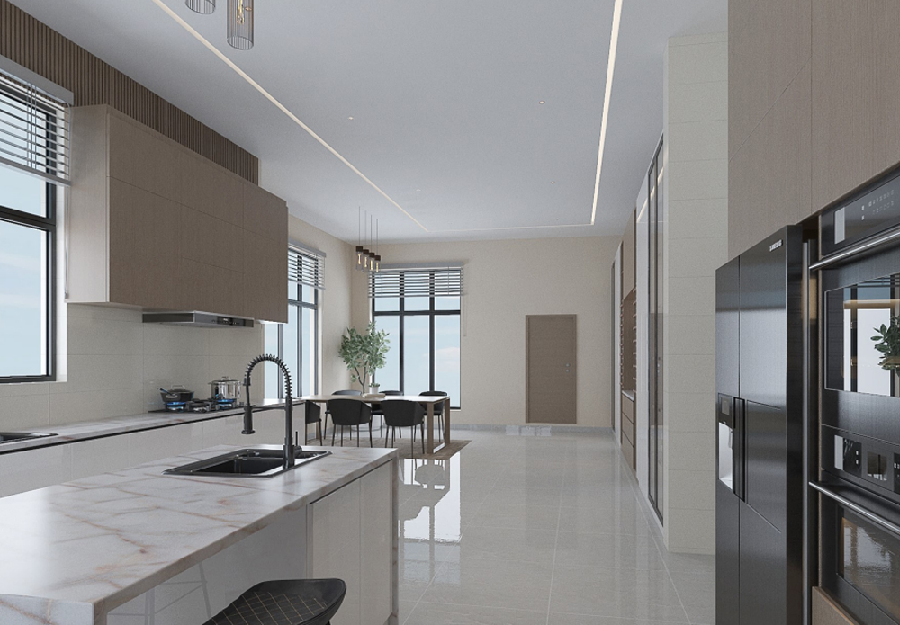 This Guzape 3D design showcases a large studio apartment with a fully open kitchen and dining concept. The layout prioritizes functionality without sacrificing aesthetics, creating a space perfect for modern urban lifestyles.