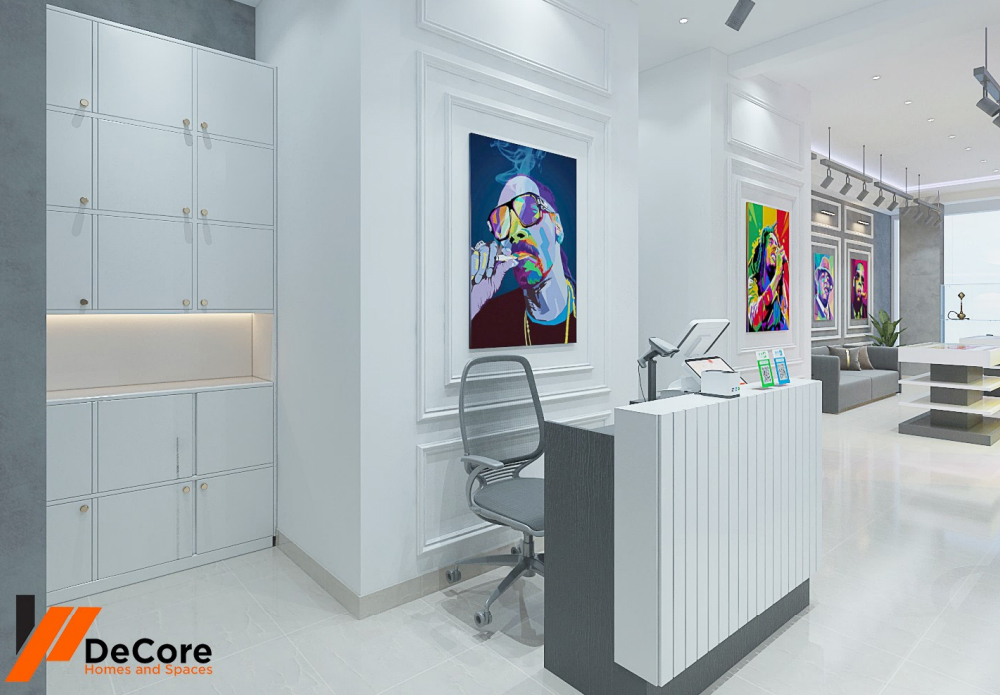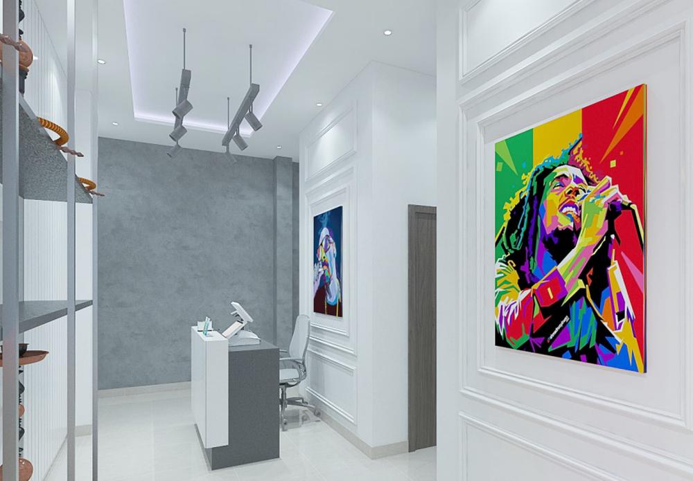 This conceptual 3D design creates a visually engaging environment for a smoke store. It includes ample product display units, an island-style counter, and a lounge area with a stylish couch for visitors. The walls are adorned with large art pieces featuring icons like Snoop Dogg and Bob Marley, creating a laid-back yet vibrant ambiance.