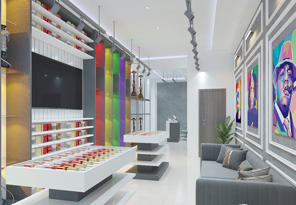 A bold and atmospheric 3D concept for a modern smoke store, blending culture, comfort, and retail efficiency.